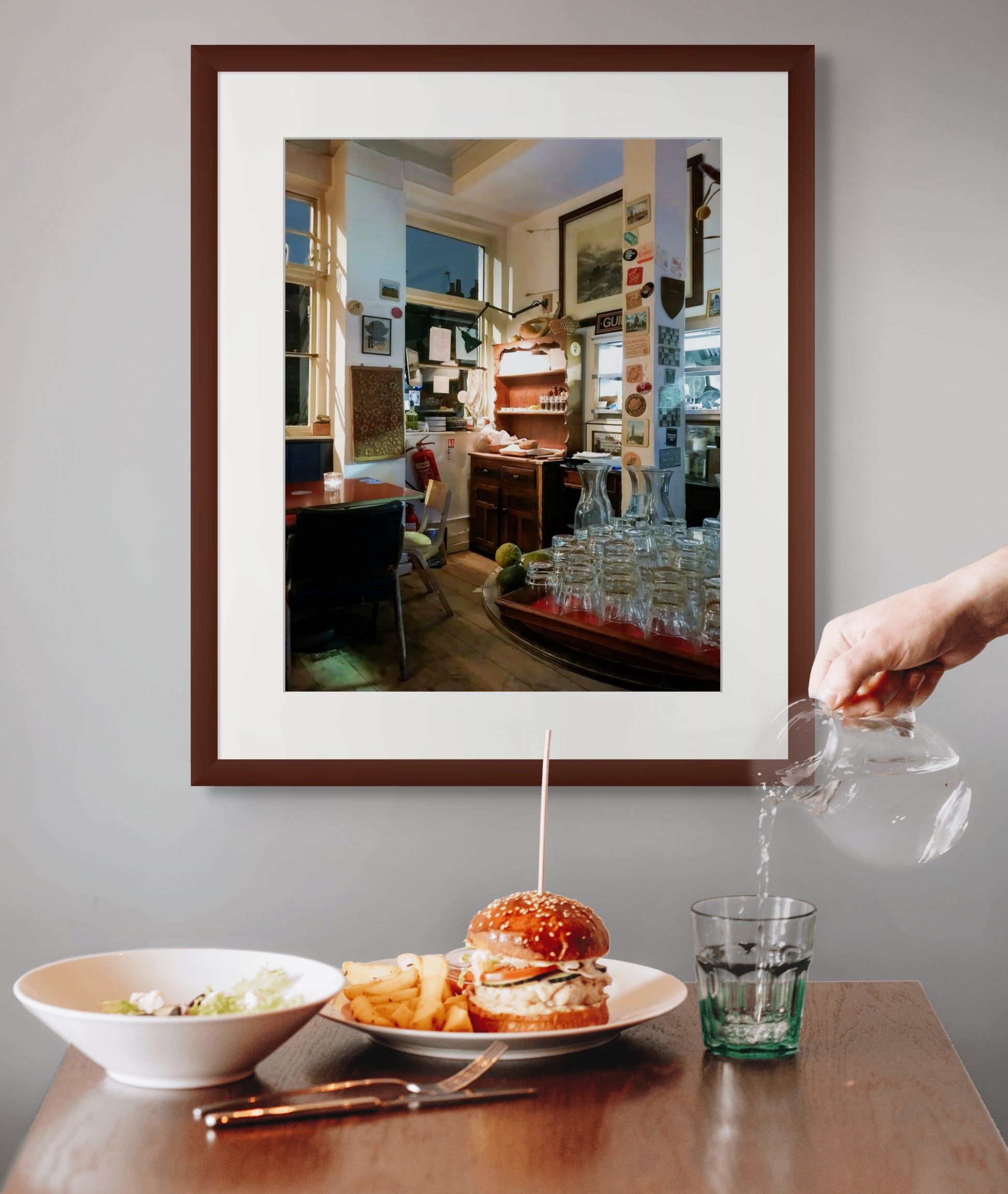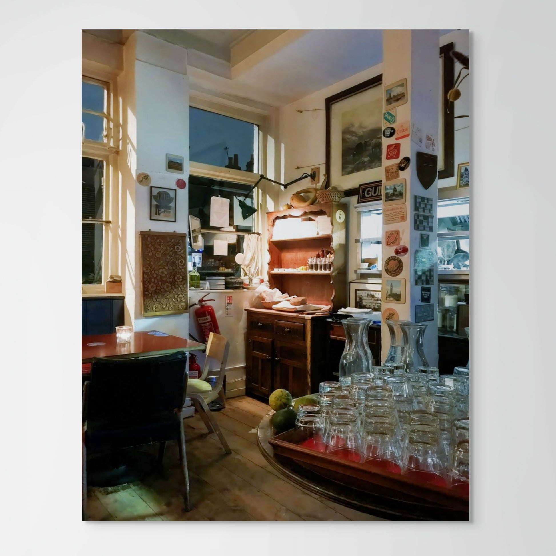 Take a peek into the warm and inviting world of a cozy pub kitchen. As the evening winds down and the pub prepares to close, capture the nostalgic feeling and charm of this beloved establishment. A must-have for any pub enthusiast, interior decorators, or anyone looking to elevate their decor, this photograph fits seamlessly into a variety of settings. Ideal for holidays, housewarmings, and any occasion where a thoughtful gift is appreciated. Hang it in your kitchen, living room, study, or gallery wall for an instant uplift.